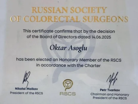 Uluslararası alanda robotik kanser cerrahisi çalışmalarıyla tanınan Genel Cerrah Prof. Dr. Oktar Asoğlu, Rusya Kolorektal Cerrahlar Derneği (RSCS) tarafından onursal üye seçildi. Prof. Dr. Asoğlu'nun onursal üyelik belgesi, Moskova'da düzenlenen törenle takdim edildi. Kanser hastalıkları, özellikle de rektum kanseri alanındaki önemli çalışmalarıyla bilinen genel cerrah Prof. Dr. Oktar Asoğlu, Rusya Kolorektal Cerrahlar...